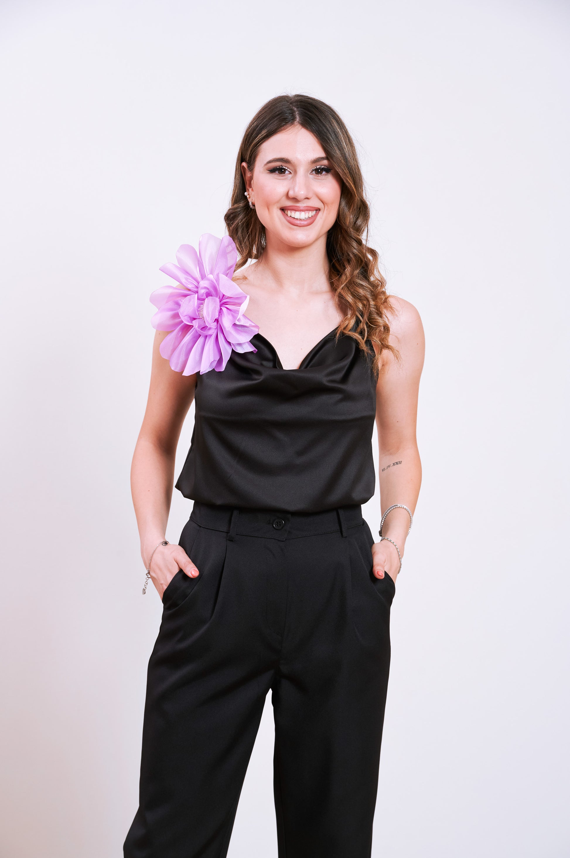 Il completo Peonia lilla è un look di gran classe. Composto da un pantalone modello palazzo in morbido tessuto e da un top sciallato con spilla fiore realizzata artigianalmente in chiffon di seta, questo completo offre un look unico ed elegante con una tocco di esclusività. Vestirlo significa elevare ogni outfit a un livello di stile superiore.