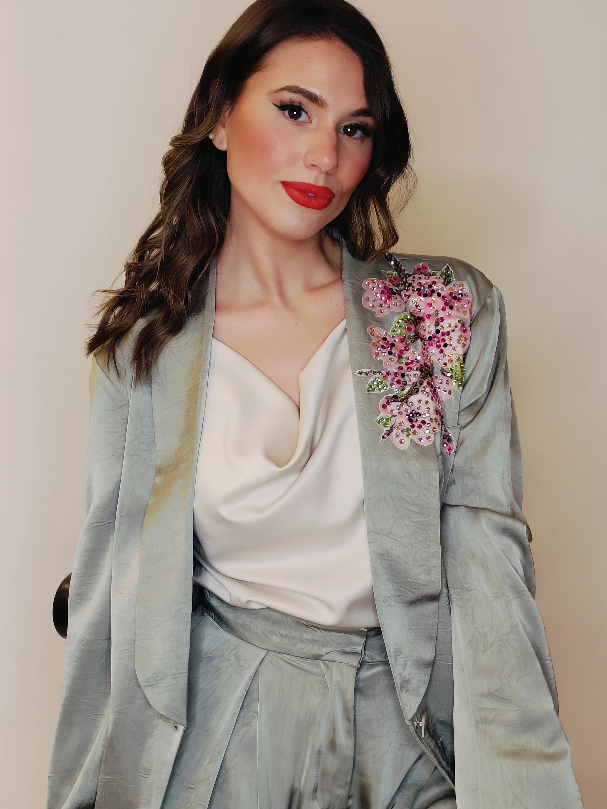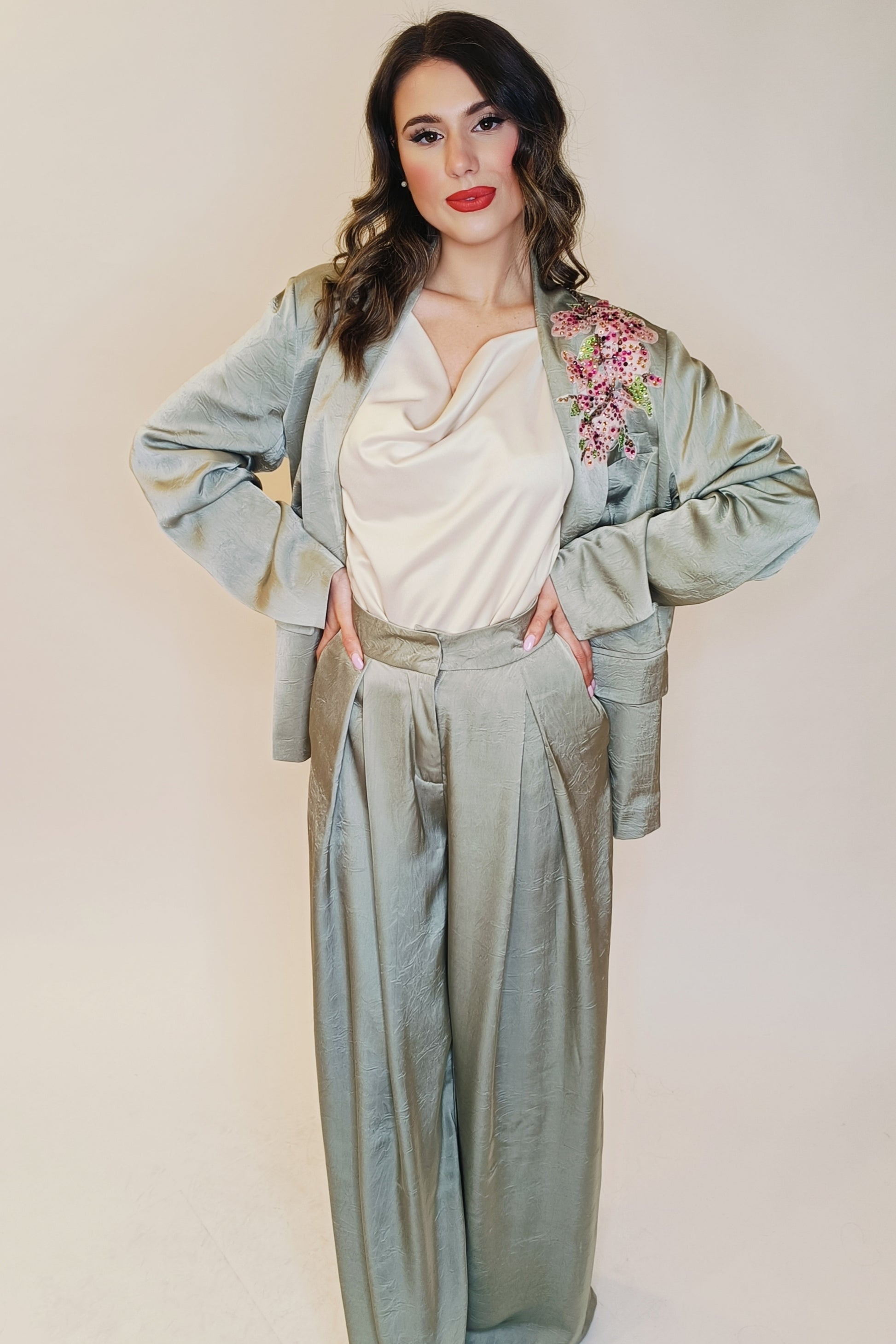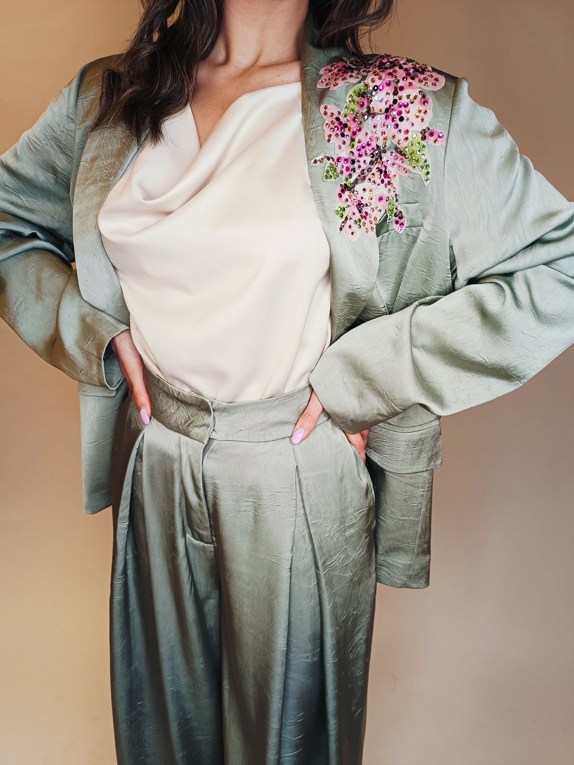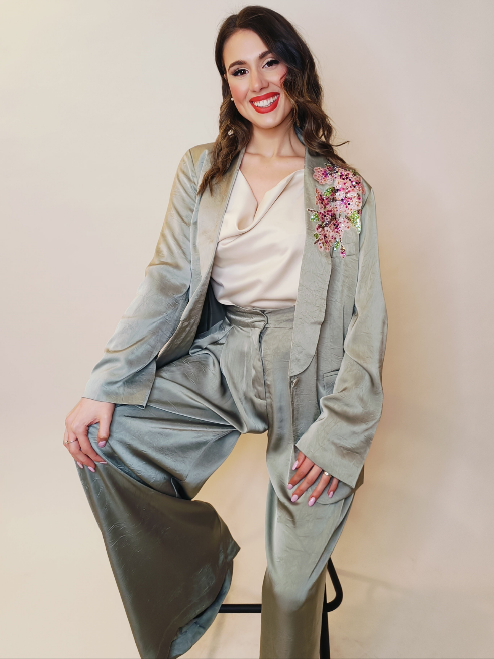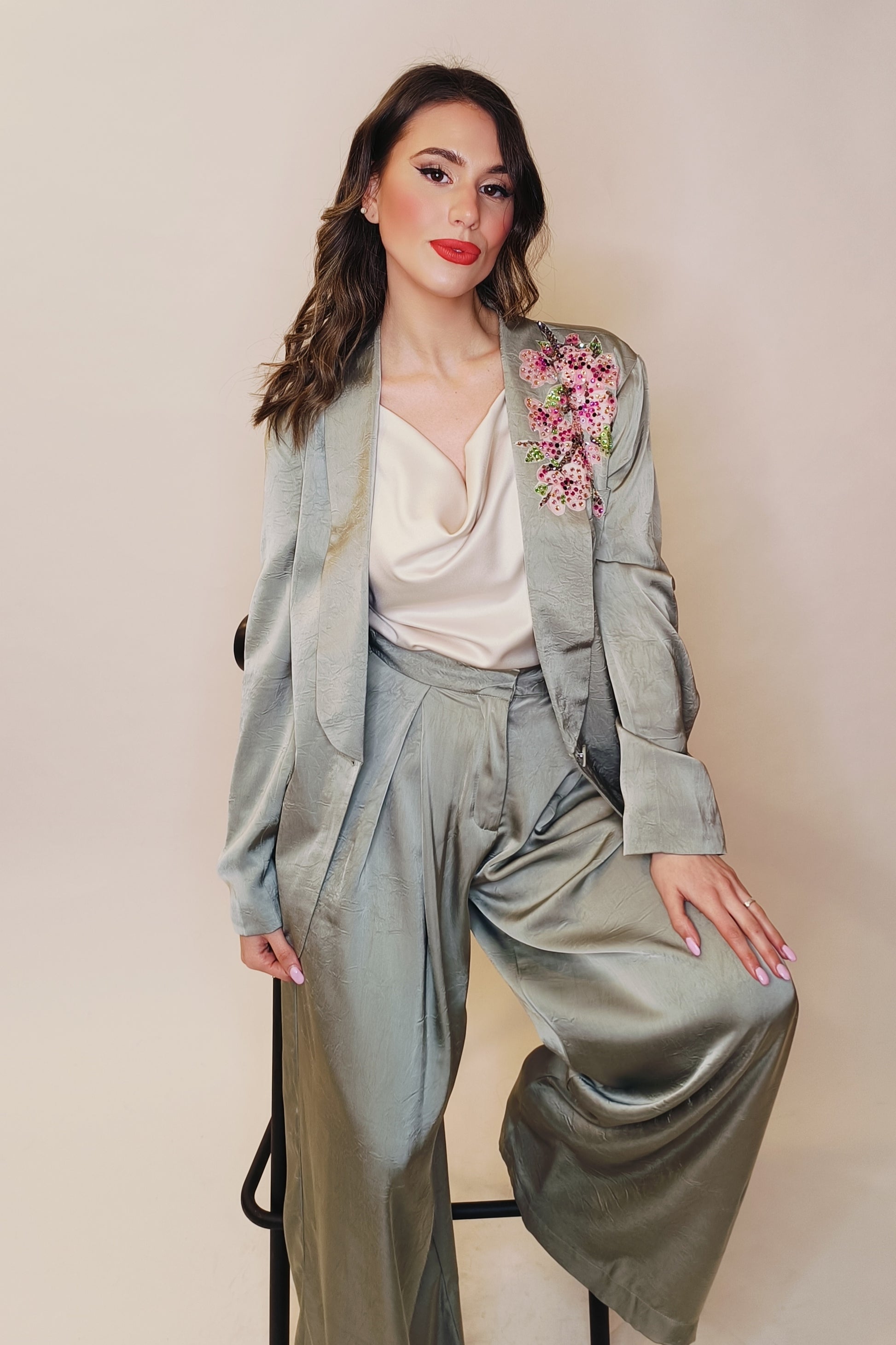 Esclusiva eleganza è il nostro completo ramo di ciliegio in cristalli. Il taglio classico e il tessuto leggermente martellato color salvia perlato , arricchito da un dettaglio sartoriale con cristalli Preciosa®, che dona una brillantezza affascinante. Un'opera d'arte da indossare, per un tocco di lusso e raffinatezza.