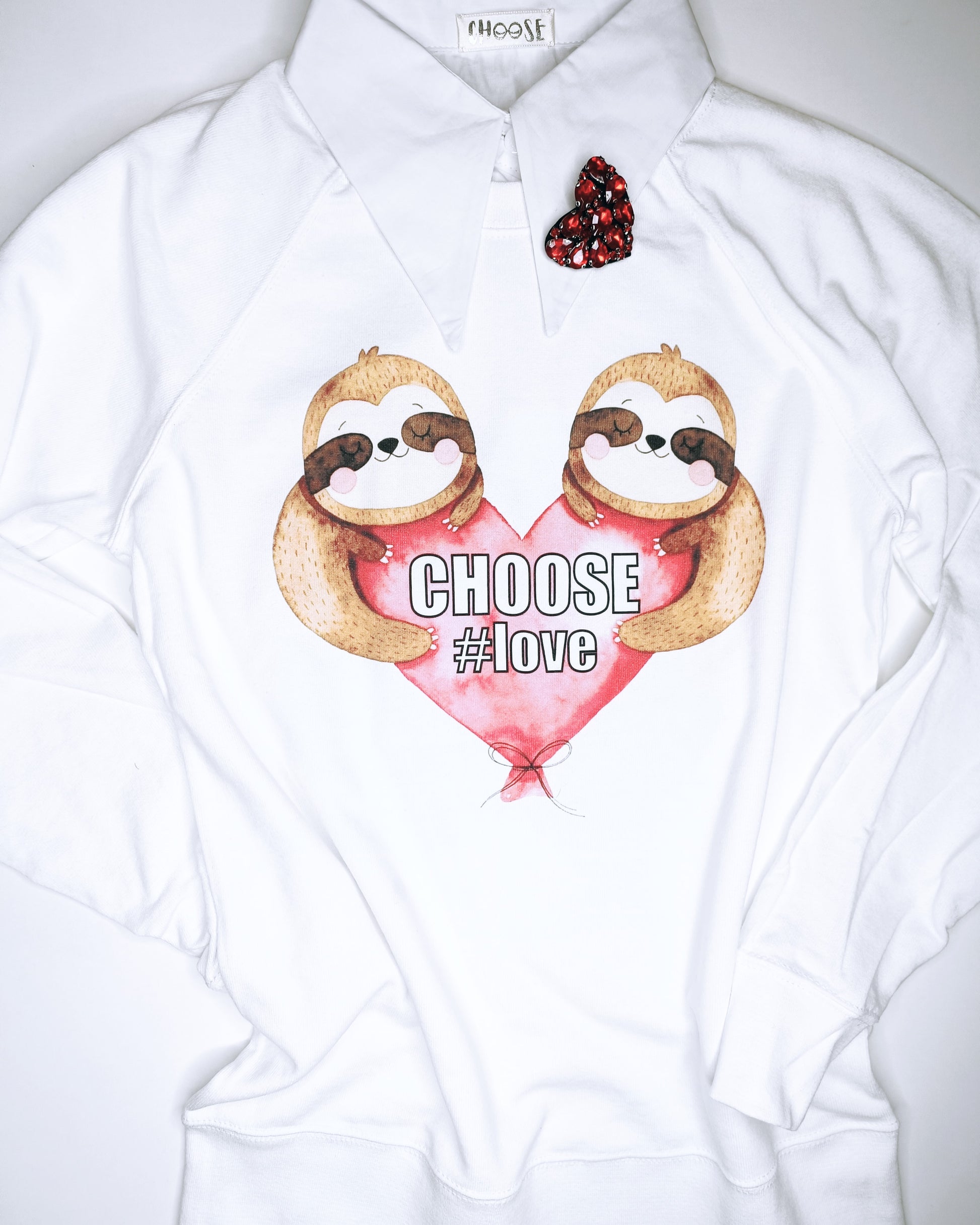 Felpa donna CHOOSE #love in morbido cotone, con dolcissima stampa bradipo e messaggio d’amore. Comoda, versatile e facile da abbinare per un look casual ma curato.