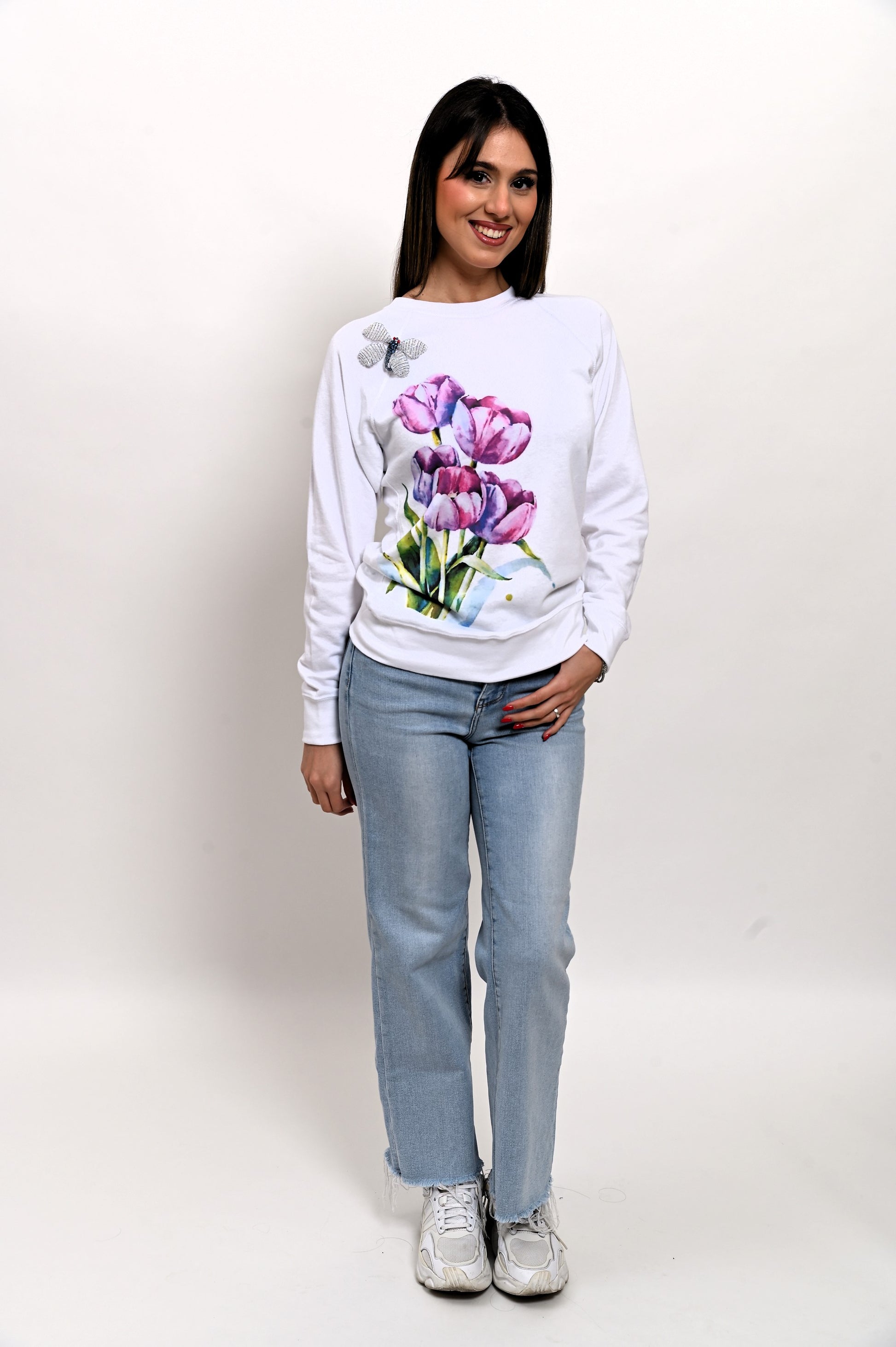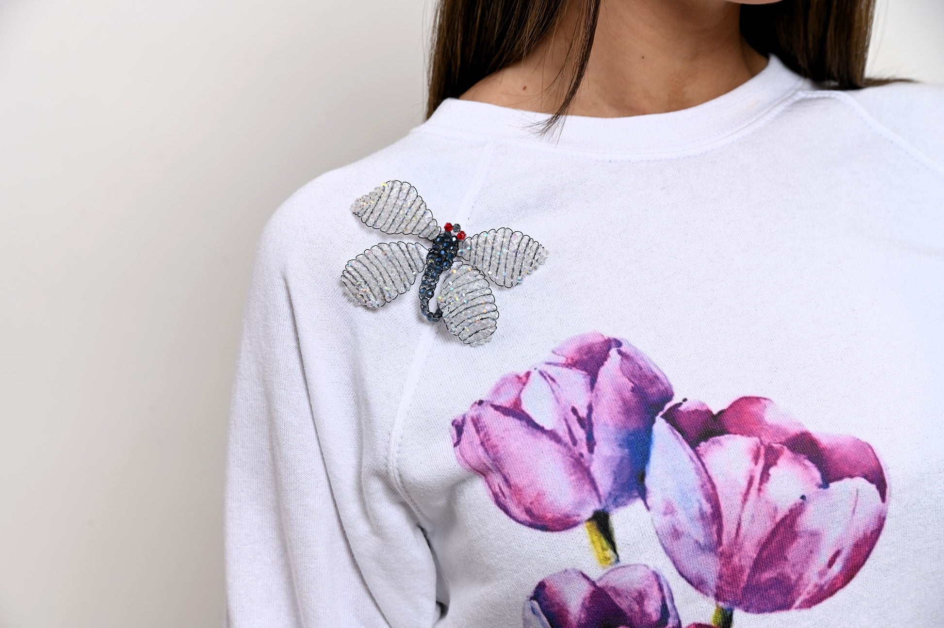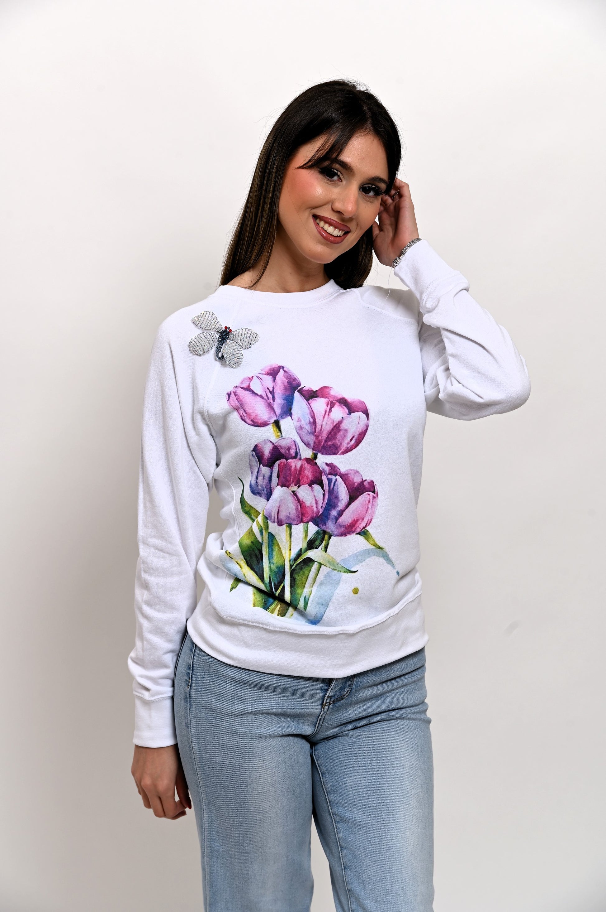 Questa felpa di alta qualità presenta un delicato motivo floreale di tulipani stampati. La spilla di perline artigianale aggiunge un tocco romantico e glamour, rendendola un capo esclusivo e di classe. Ideale per un look sofisticato e di tendenza.
