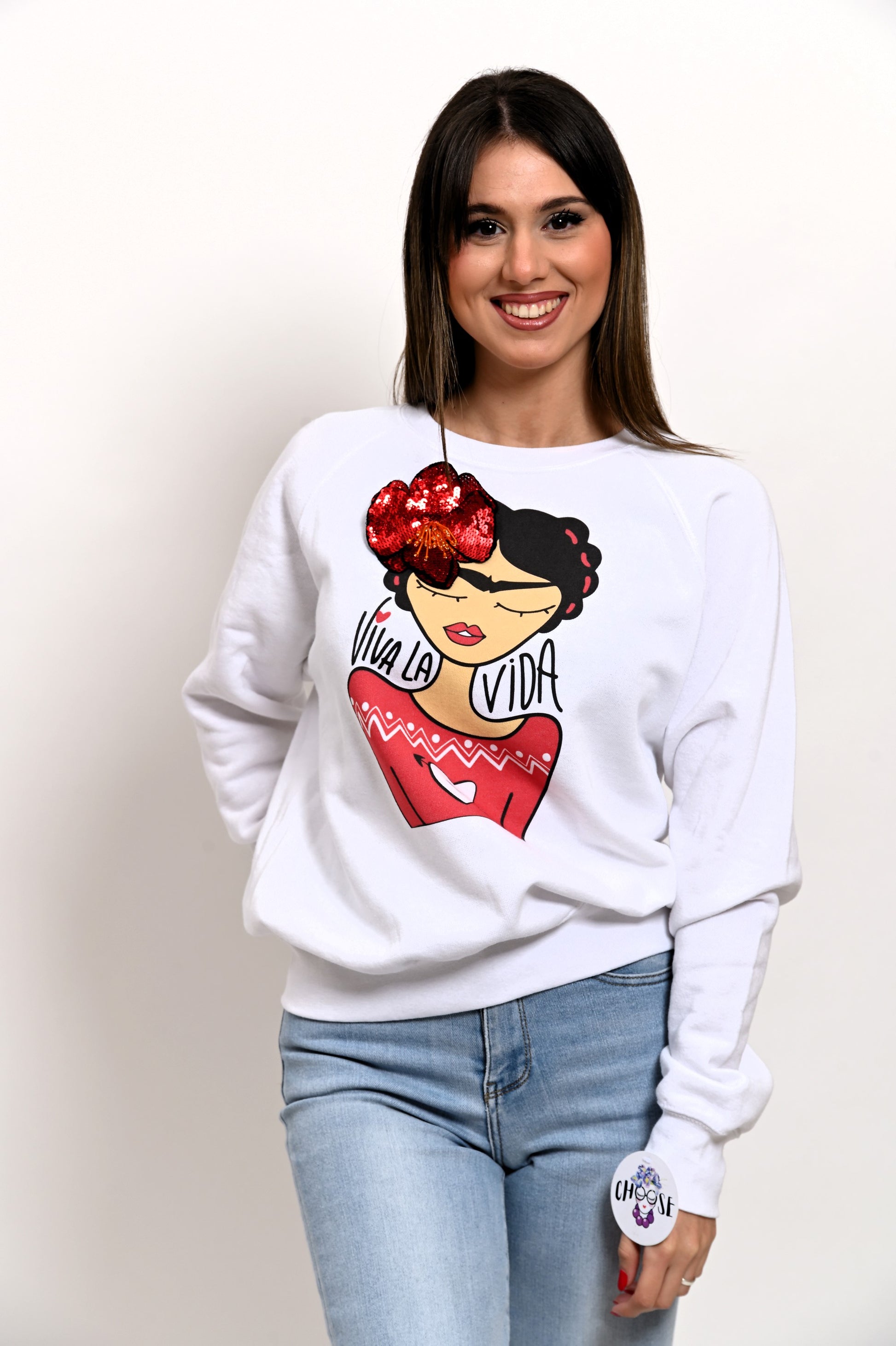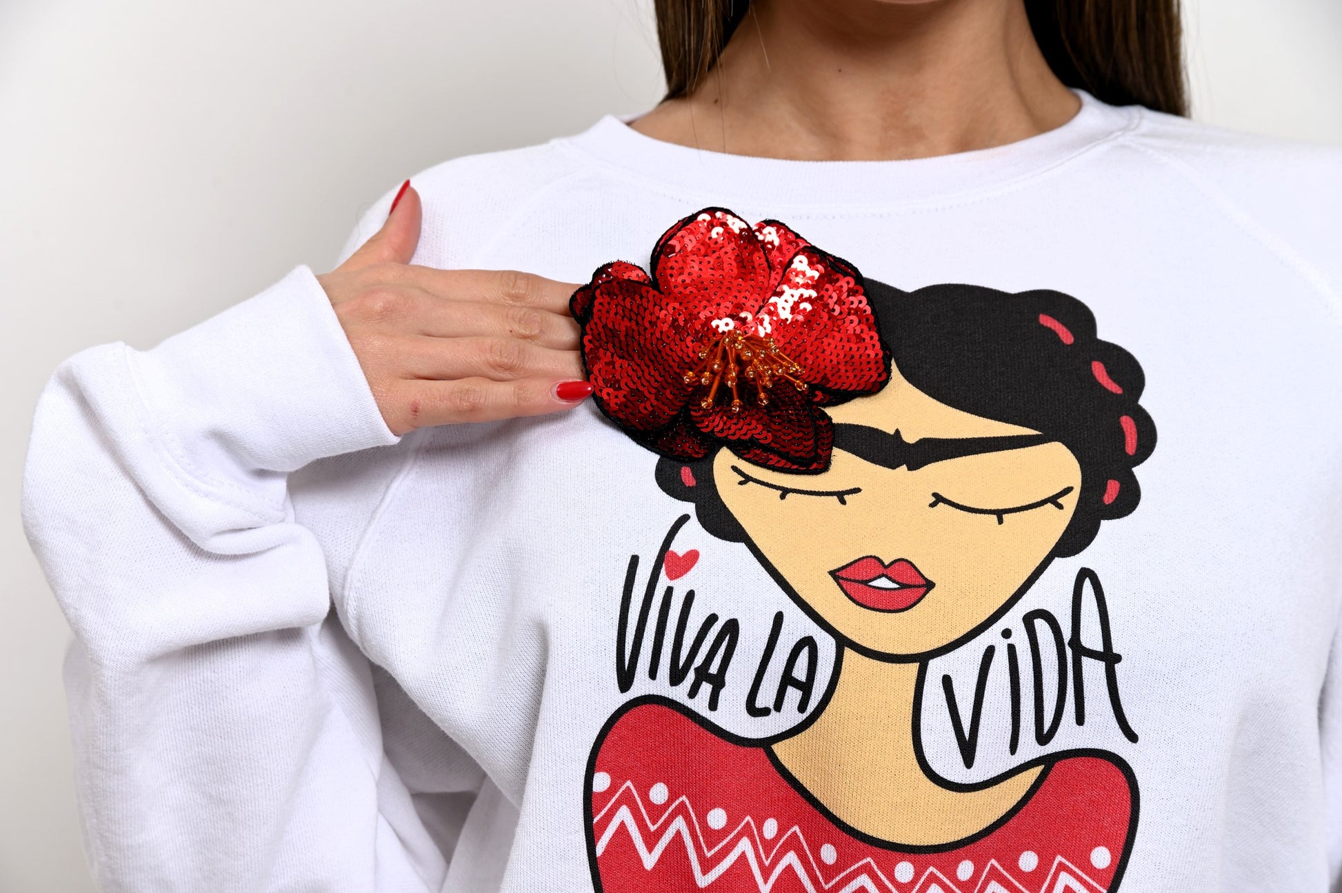Scendi in strada con un look allegro e positivo con la nostra Felpa "Viva la Vida"! Colori vibranti e una stampa ecosostenibile anallergica, abbellita da un fiore in paillettes tridimensionale removibile, che si ispira all'arte di Frida Kahlo e al suo motto! Viva la vita al massimo!