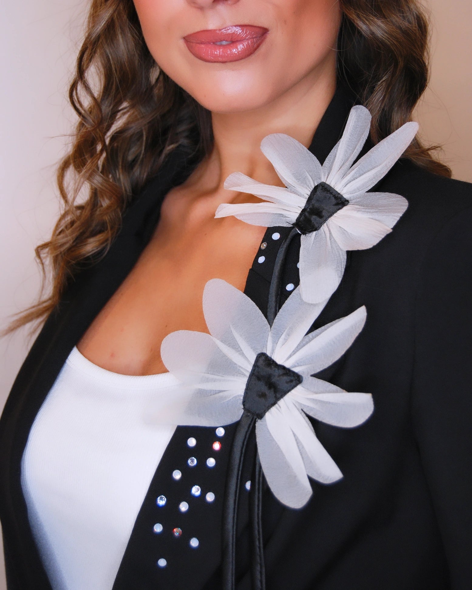 Doppiopetto,arricchita da fiori e cristalli, foderata . Curata nei dettagli,per uno stile che incanta!