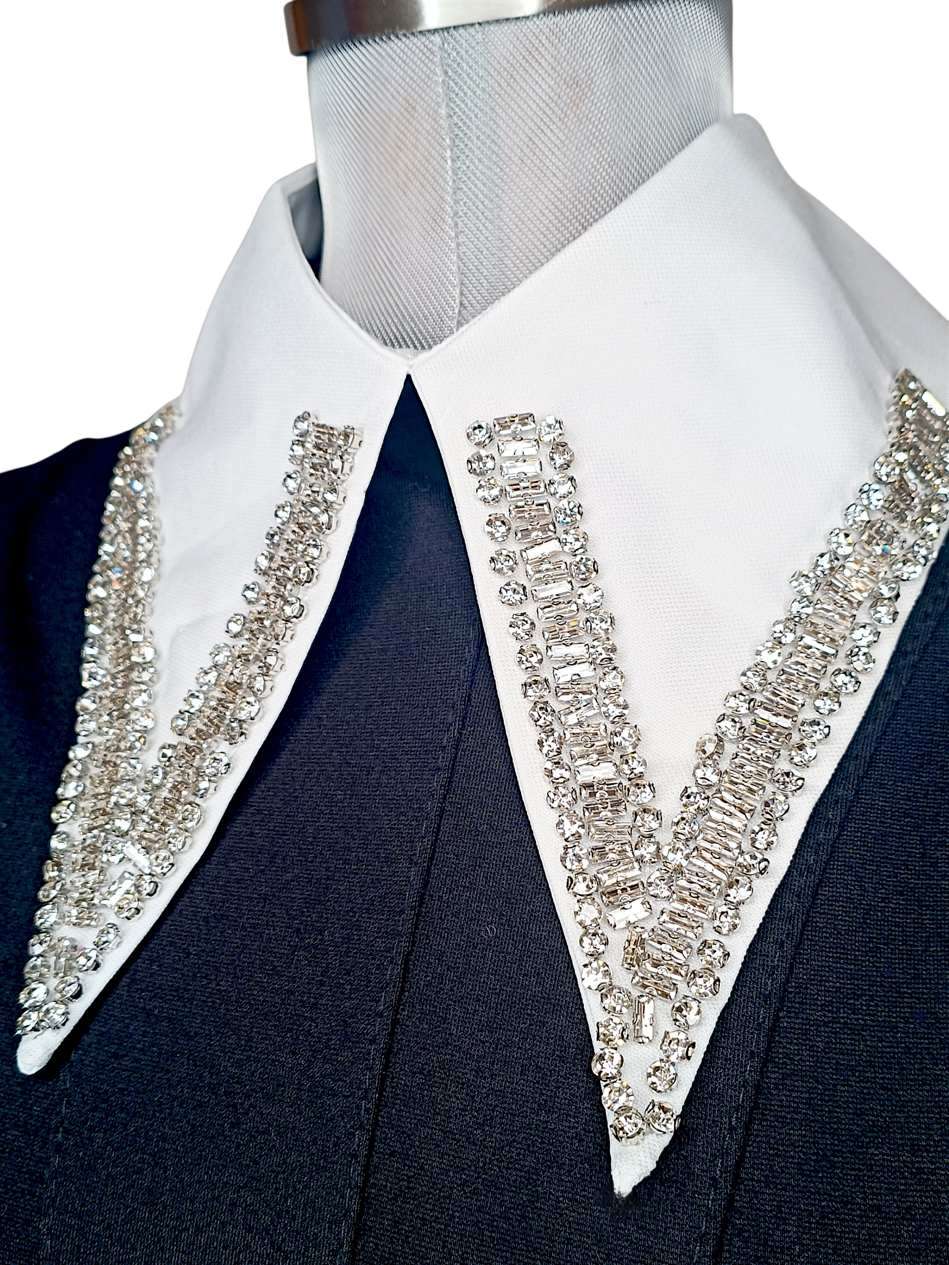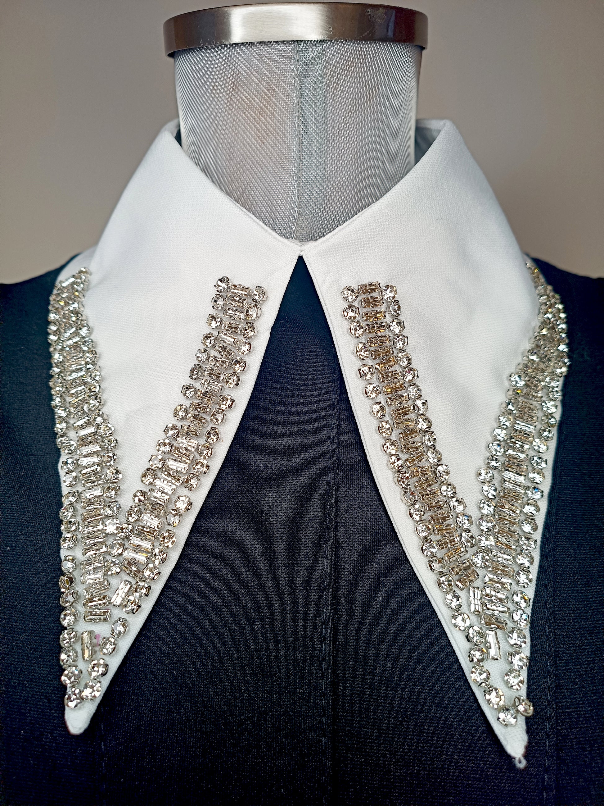 Colletto bianco a punta, impreziosito da strass e baguette luminose per un effetto elegante e super chic. Perfetto per trasformare anche il look più semplice in qualcosa di speciale 💎🤍